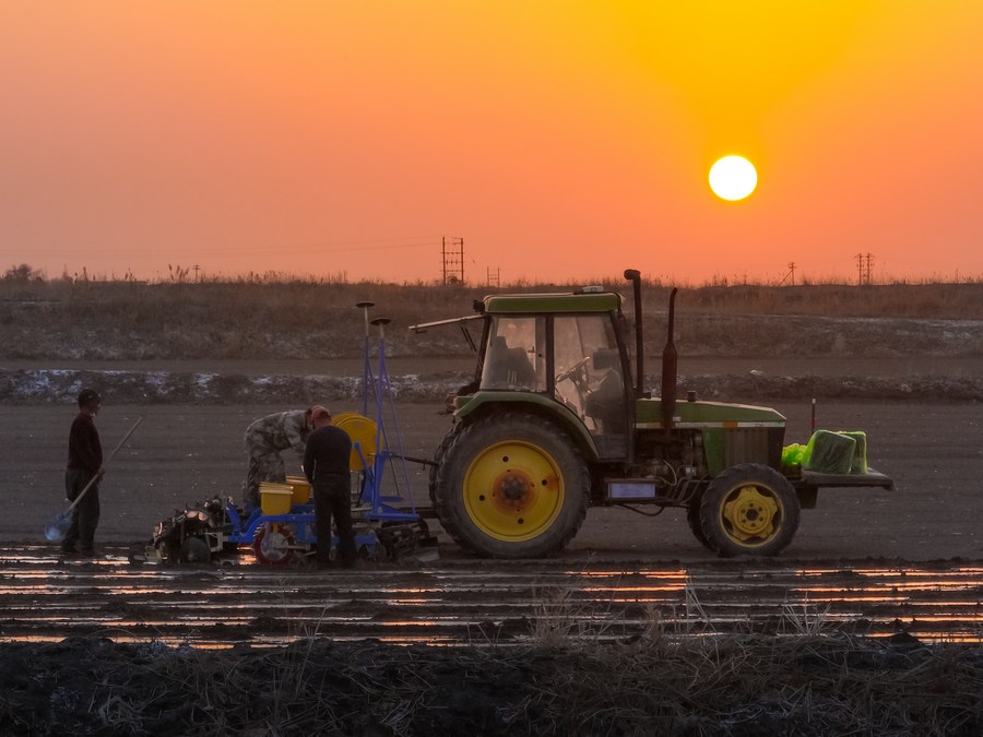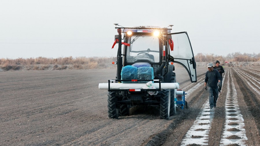 A seeding machine with Beidou Navigation Satellite System works in a cotton field in Korla City, northwest China's Xinjiang Uygur Autonomous Region, April 3, 2022. (Photo by Huang Wanli/Xinhua)