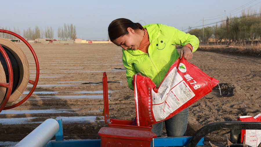 A farmer pours cotton seeds into a seeding machine in Xayar County, Aksu Prefecture, northwest China's Xinjiang Uygur Autonomous Region, April 3, 2022. (Photo by Liu Yuzhu/Xinhua)