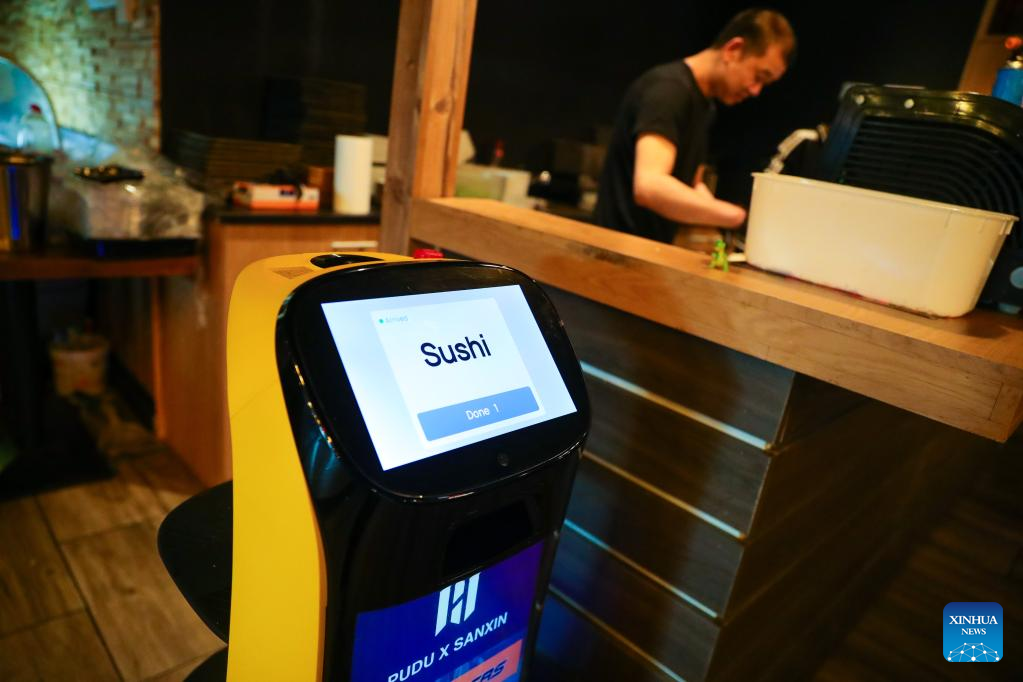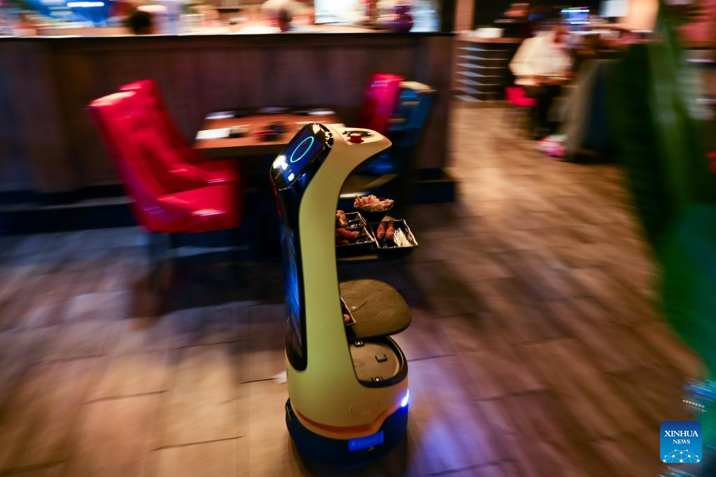 A robot serves dishes at a restaurant in Sint-Niklaas, East Flanders, Belgium, April 9, 2022. Two service robots, designed and manufactured in China, became the "stars" of a restaurant in Sint-Niklaas in Belgium. They not only reduced the cost for the restaurant, but also won popularity among the customers. (Xinhua/Zheng Huansong)