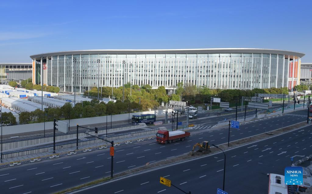 Photo taken on April 9, 2022 shows the exterior view of a makeshift hospital converted from the National Exhibition and Convention Center (Shanghai) in east China's Shanghai. (Xinhua/Li He)