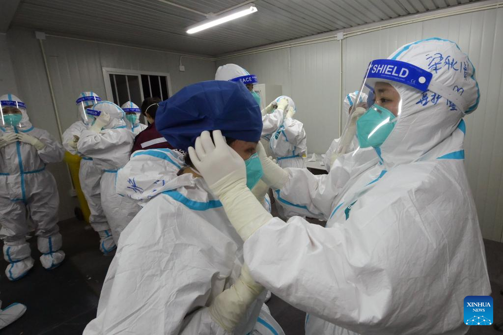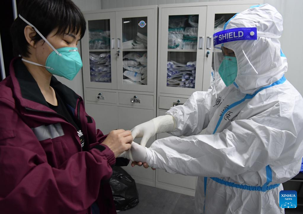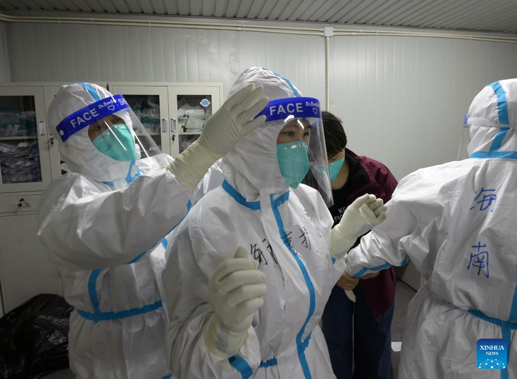 Supportive medics from Hainan Province prepare to enter the Jiading Nanxiang makeshift hospital for COVID-19 patients in east China's Shanghai, April 8, 2022. The Jiading Nanxiang makeshift hospital started operation on Friday, offering more than 1,700 beds for COVID-19 patients. (Xinhua/Li He)