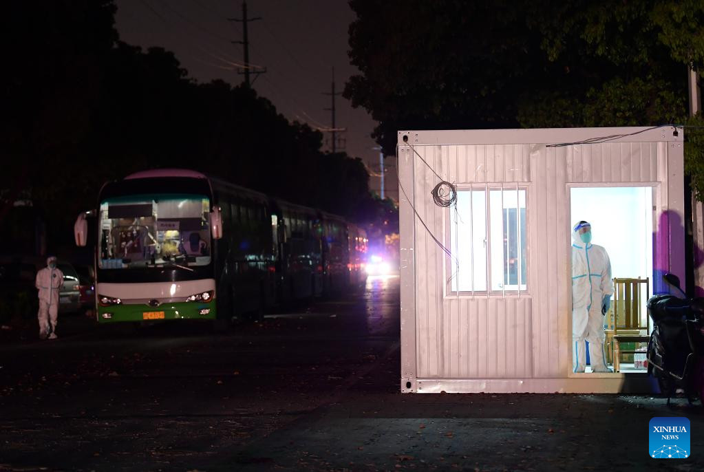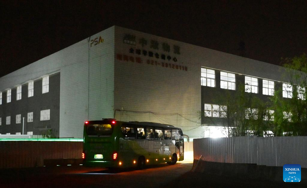 A transfer bus carrying COVID-19 patients runs in the area of the Jiading Nanxiang makeshift hospital in east China's Shanghai, April 8, 2022. The Jiading Nanxiang makeshift hospital started operation on Friday, offering more than 1,700 beds for COVID-19 patients. (Xinhua/Li He)
