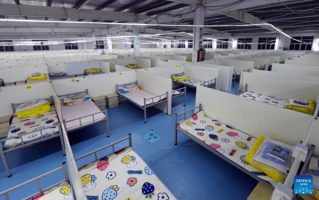 Photo taken on April 8, 2022 shows the interior view of the Jiading Nanxiang makeshift hospital for COVID-19 patients in east China's Shanghai. The Jiading Nanxiang makeshift hospital started operation on Friday, offering more than 1,700 beds for COVID-19 patients. (Xinhua/Li He)