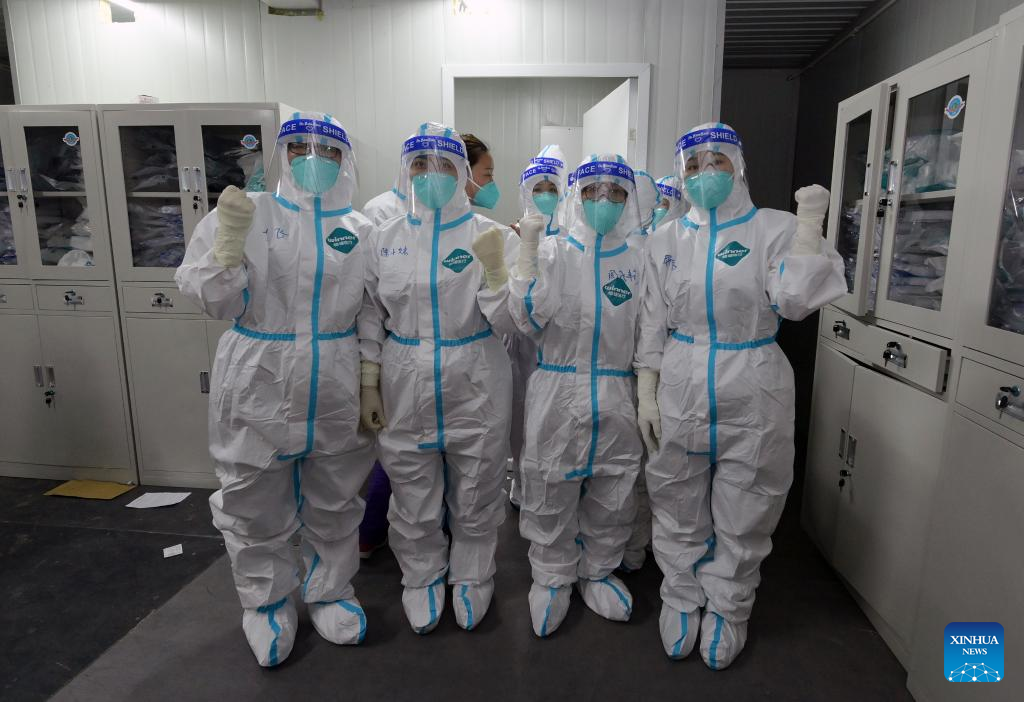 Supportive medics from Hainan Province pose for photos before entering the Jiading Nanxiang makeshift hospital for COVID-19 patients in east China's Shanghai, April 8, 2022. The Jiading Nanxiang makeshift hospital started operation on Friday, offering more than 1,700 beds for COVID-19 patients. (Xinhua/Li He)