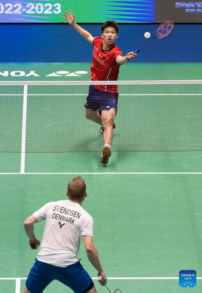 Weng Hongyang (top) of China hits a return during the men's singles semifinal against Victor Svendsen of Denmark at the BWF Korea Open Badminton Championships 2022 in Suncheon, South Korea, April 9, 2022. (Photo by James Lee/Xinhua)