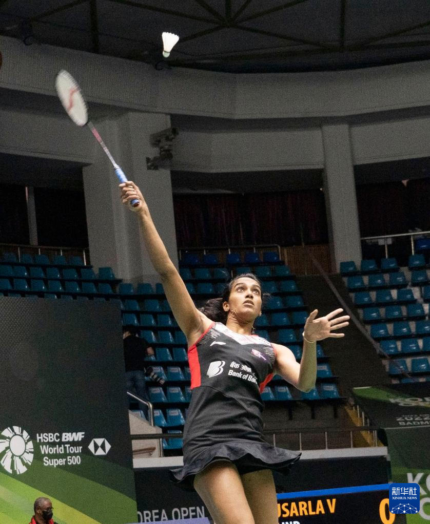 Pusarla V. Sindhu of India hits a return during the women's singles semifinal match against An Seyoung of South Korea at the BWF Korea Open Badminton Championships 2022 in Suncheon, South Korea, April 9, 2022. (Photo by James Lee/Xinhua)