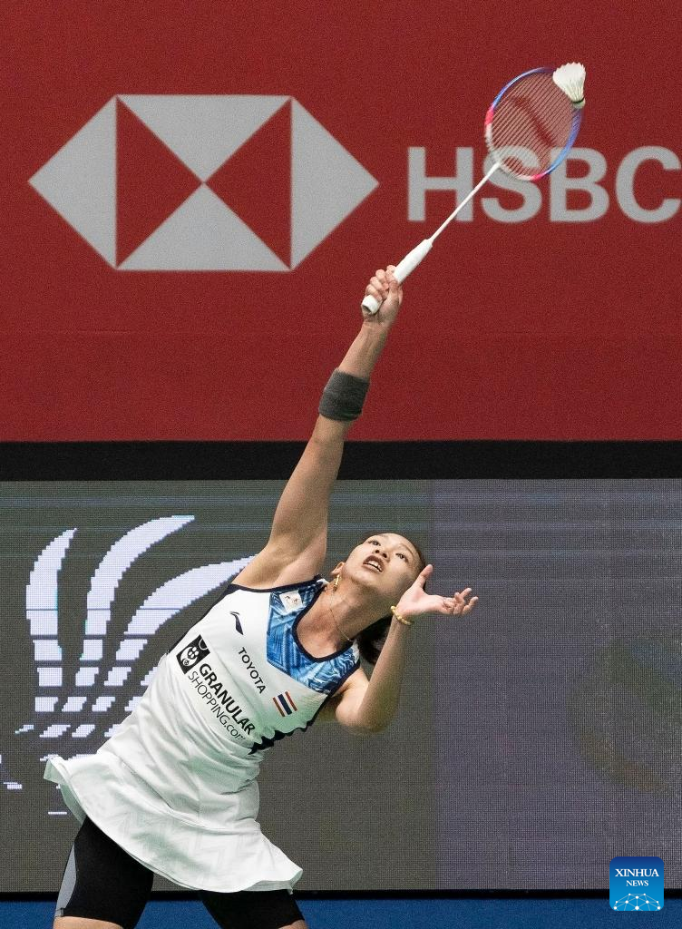 Pornpawee Chochuwong of Thailand hits a return during the women's singles semifinal match against Kim Gaeun of South Korea at the BWF Korea Open Badminton Championships 2022 in Suncheon, South Korea, April 9, 2022. (Photo by James Lee/Xinhua)