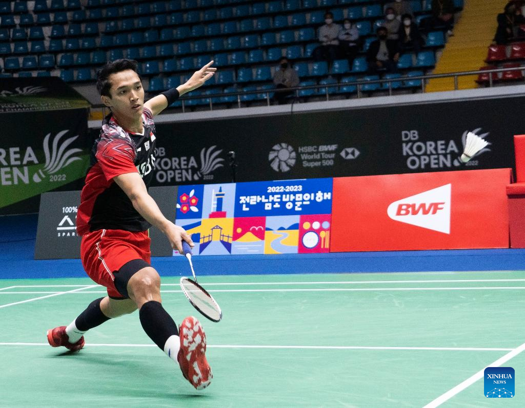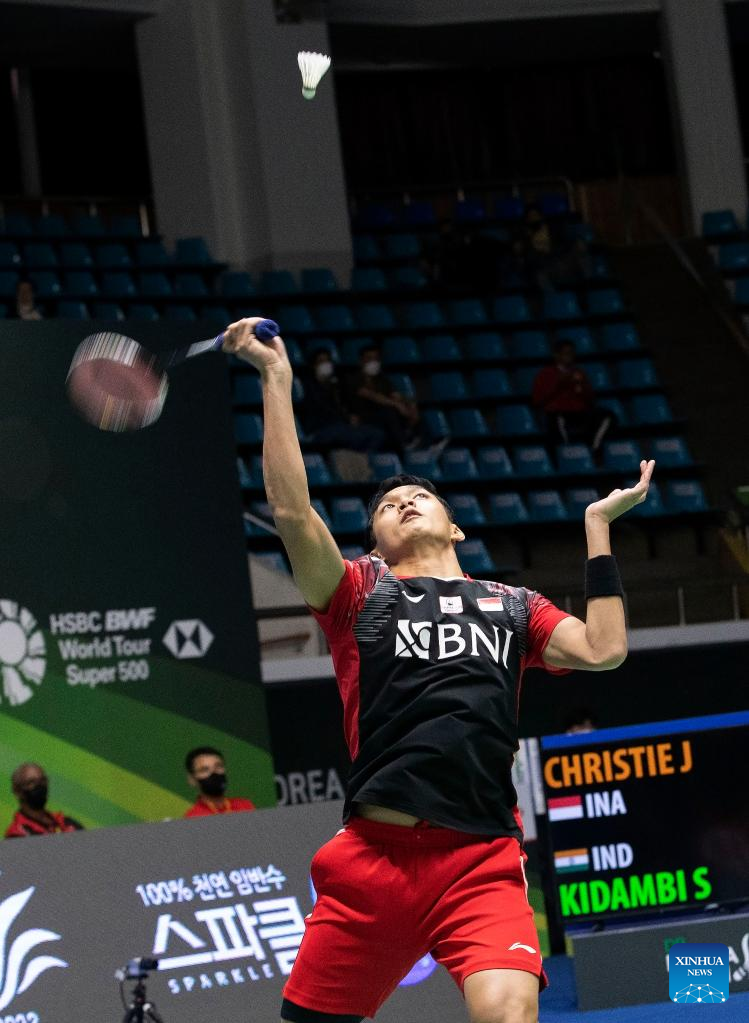 Jonatan Christie of Indonesia hits a return during the men's singles semifinal against Kidambi Srikanth of India at the BWF Korea Open Badminton Championships 2022 in Suncheon, South Korea, April 9, 2022. (Photo by James Lee/Xinhua)