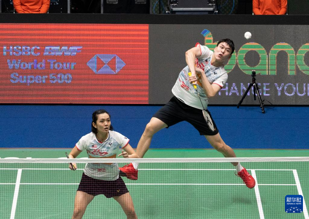 Tan Kian Meng (R)/Lai Pei Jing of Malaysia compete during the mixed doubles semifinals match against Rinov Rivaldy/Pitha Haningtyas Mentari of Indonesia at the BWF Korea Open Badminton Championships 2022 in Suncheon, South Korea, April 9, 2022. (Photo by James Lee/Xinhua)