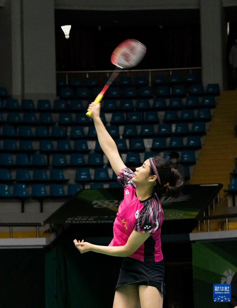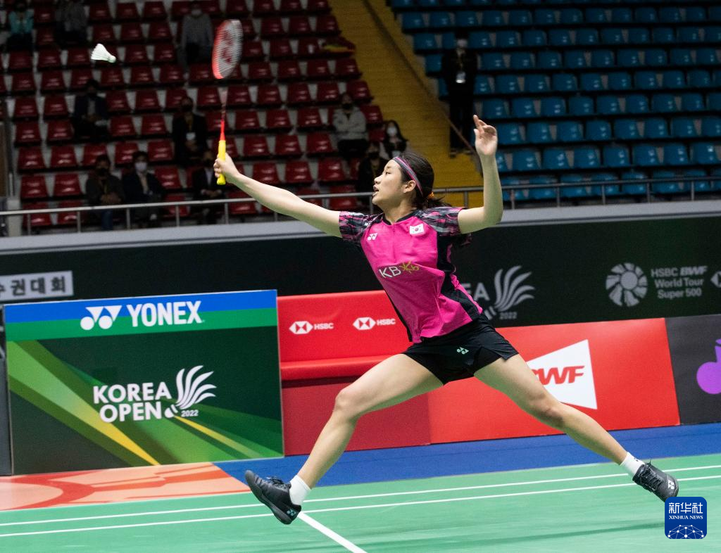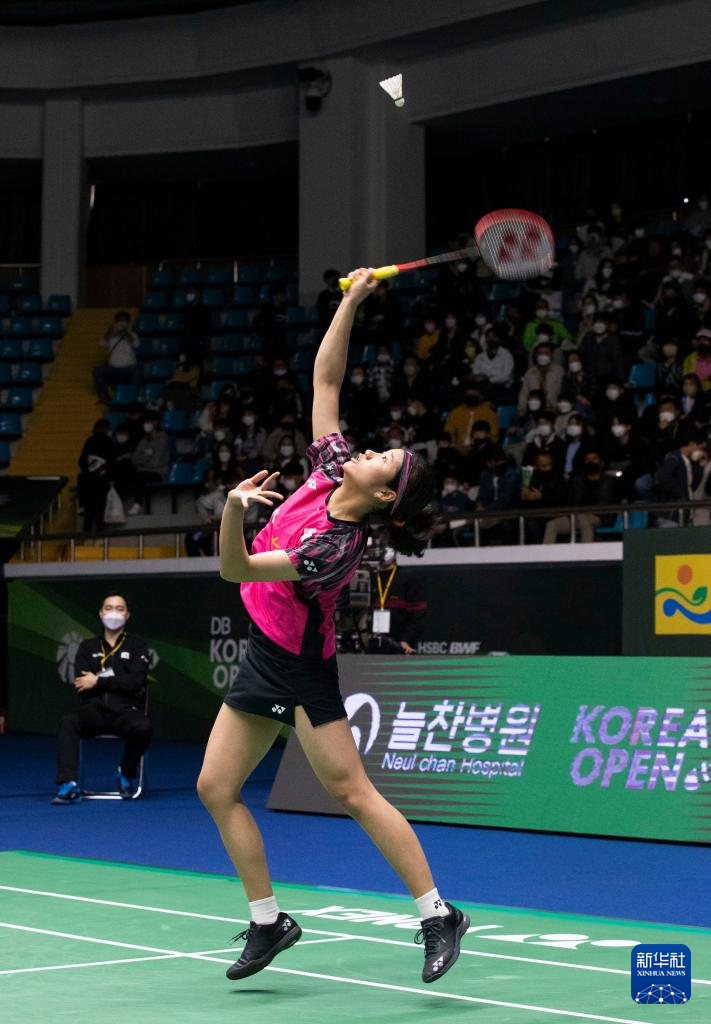 An Seyoung of South Korea hits a return during the women's singles semifinal match against Pusarla V. Sindhu of India at the BWF Korea Open Badminton Championships 2022 in Suncheon, South Korea, April 9, 2022. (Photo by James Lee/Xinhua)