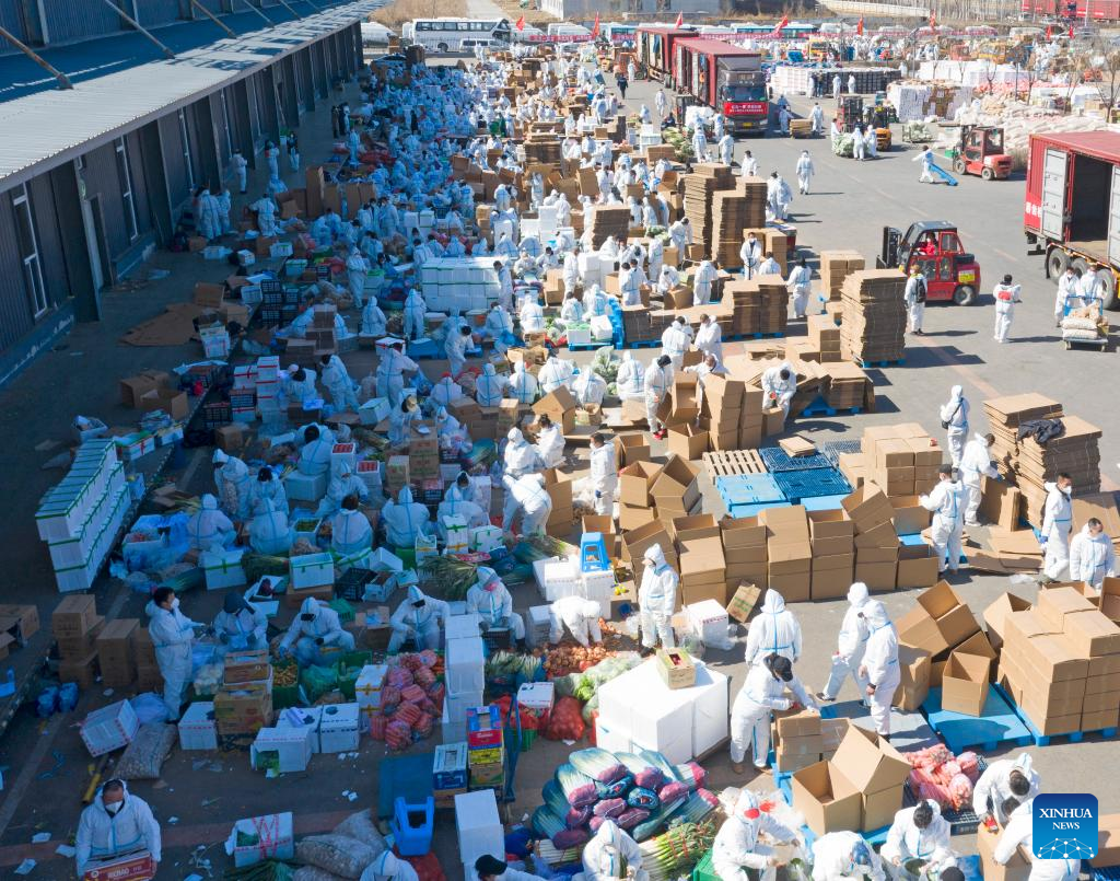 Aerial photo taken on April 6, 2022 shows staff members and volunteers sorting out vegetables at an agricultural products distribution center in Shenyang, capital of northeast China's Liaoning Province. Authorities in Liaoning have made great efforts in allocating and transporting vegetables to support Jilin, a province which is in its latest COVID-19 resurgence. (Xinhua)