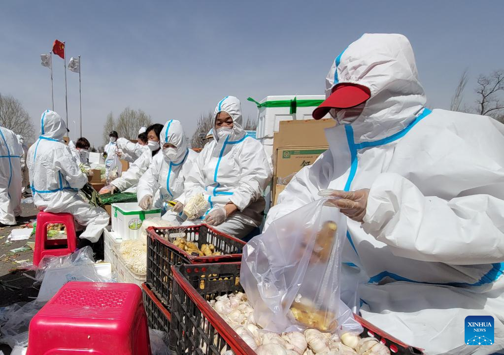Volunteers carry vegetables at an agricultural products distribution center in Shenyang, capital of northeast China's Liaoning Province, April 4, 2022. Authorities in Liaoning have made great efforts in allocating and transporting vegetables to support Jilin, a province which is in its latest COVID-19 resurgence. (Xinhua)