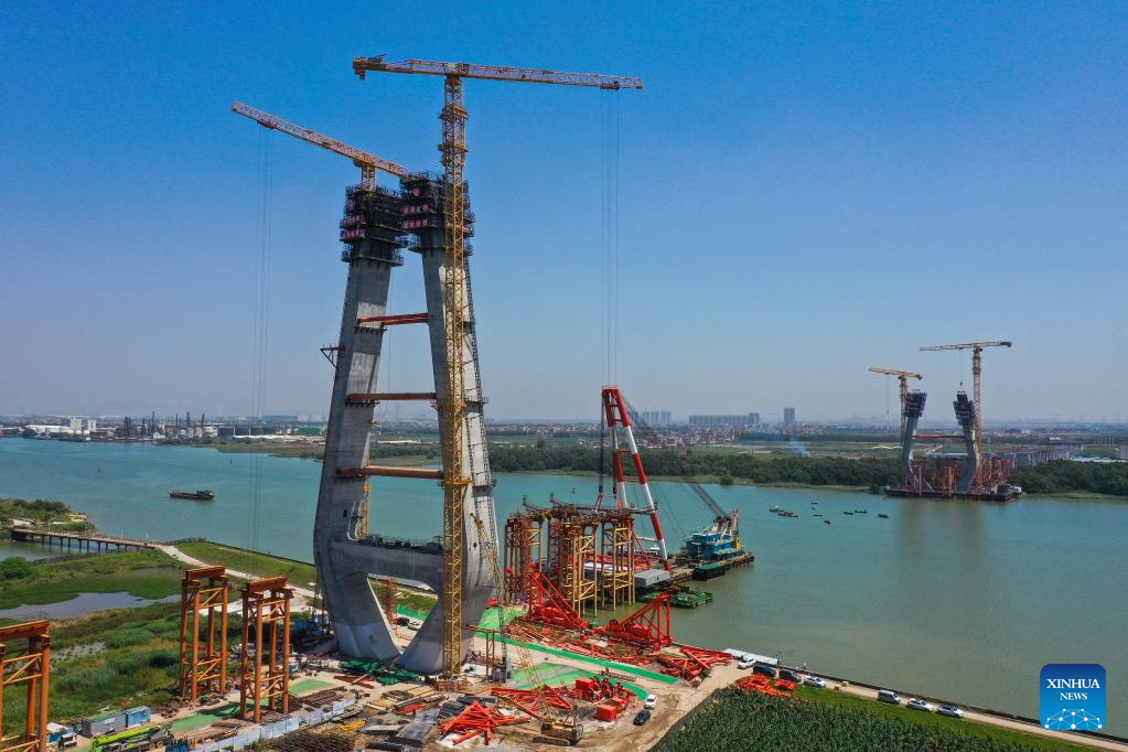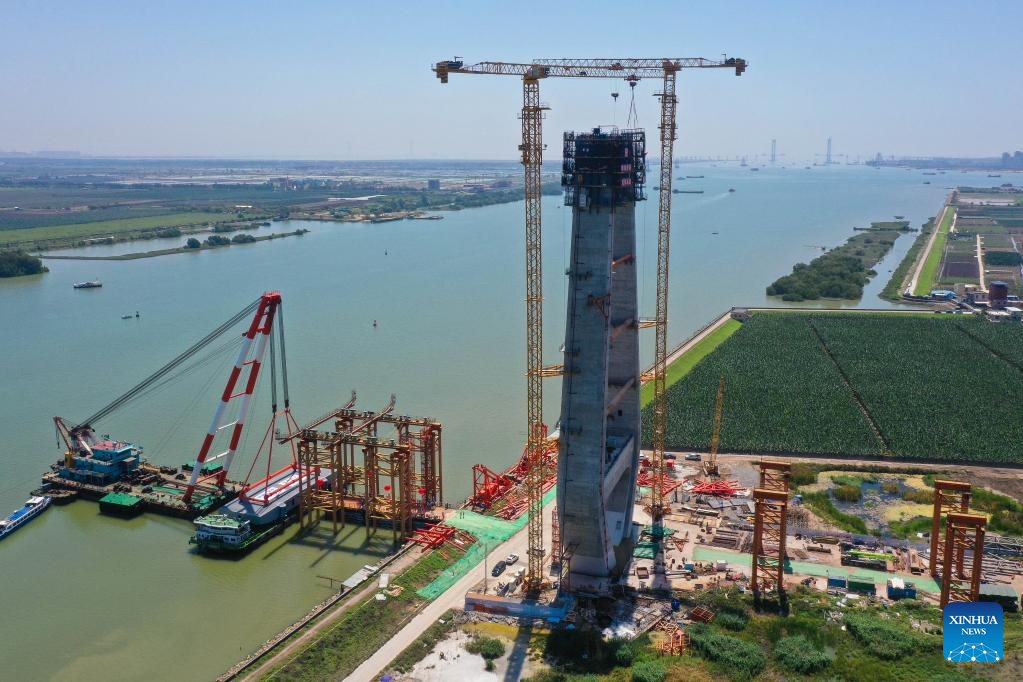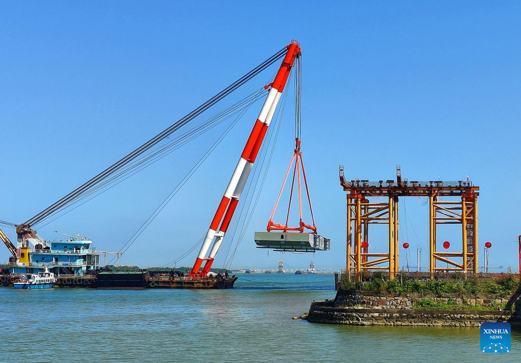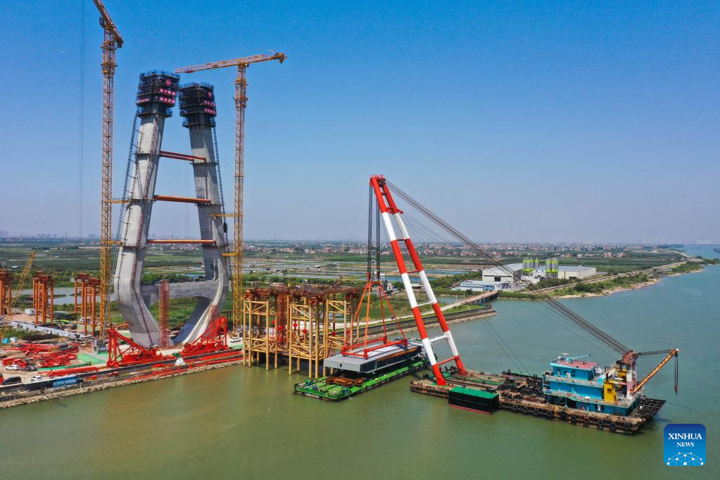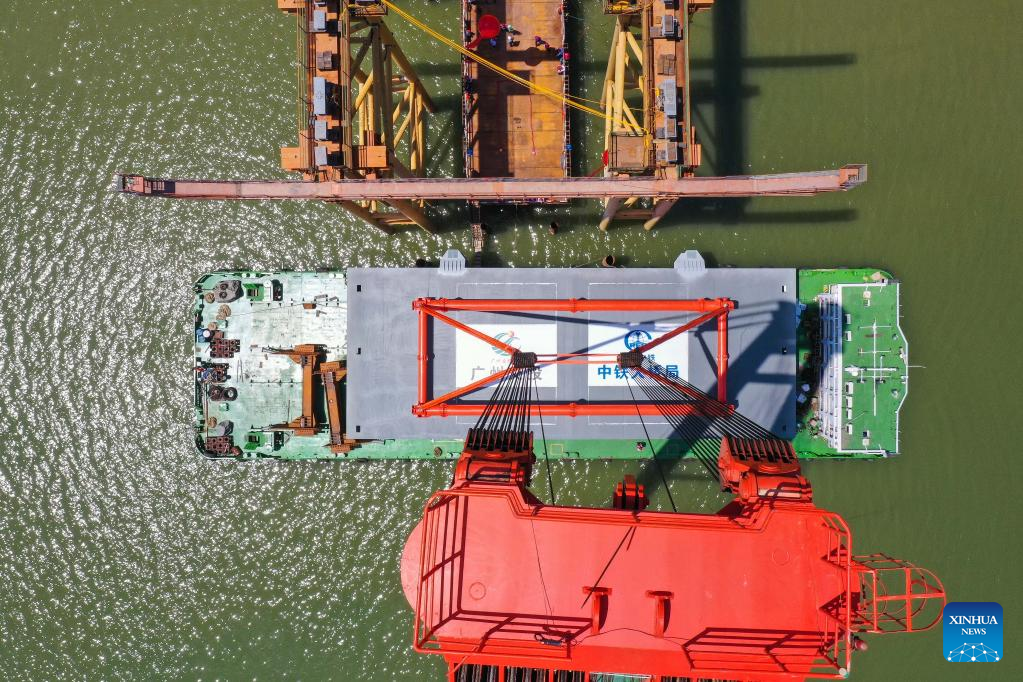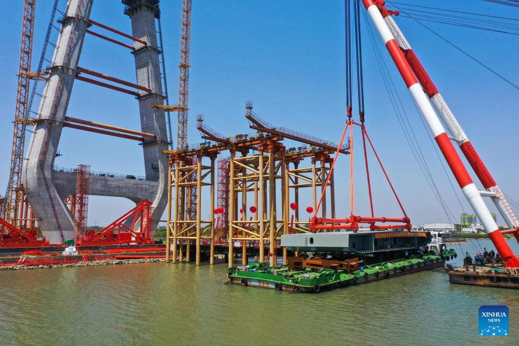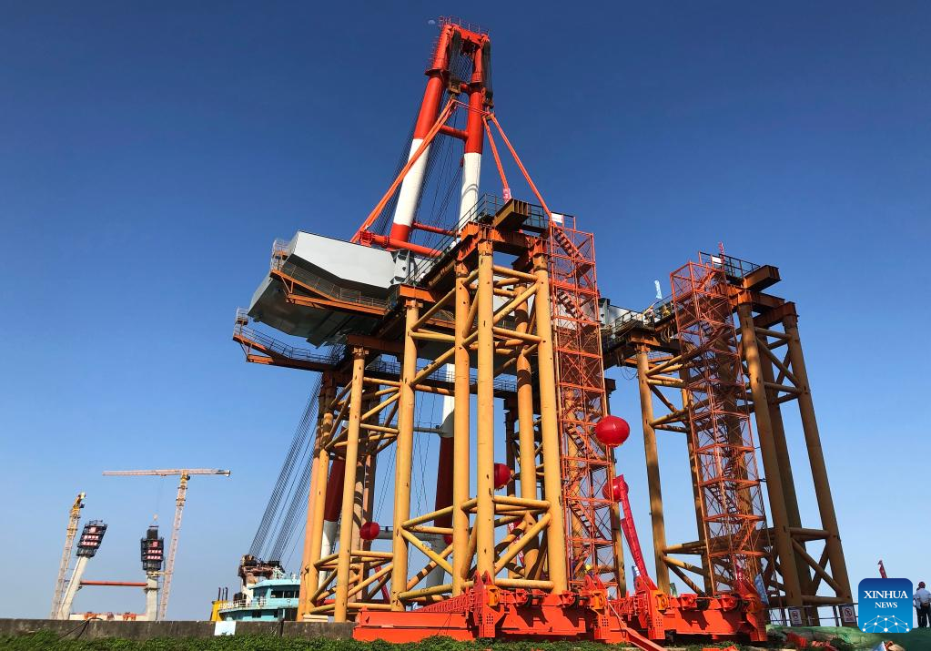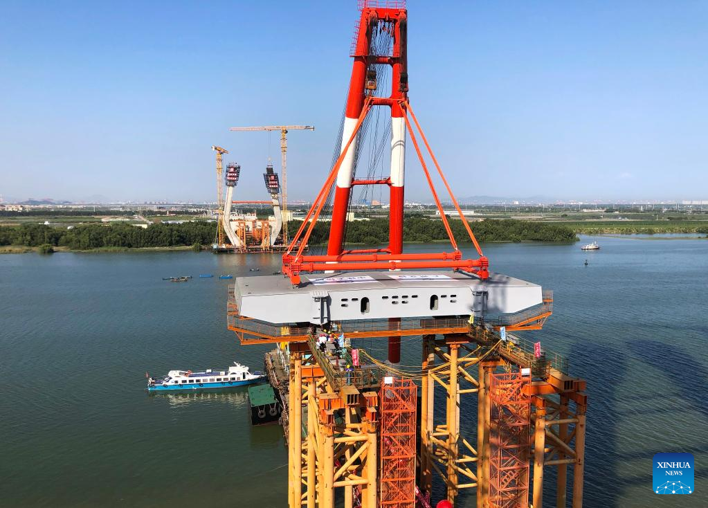The first steel box girder is set up on the main bridge at the construction site of Hongqimen bridge in south China's Guangdong Province, April 10, 2022. Hongqimen bridge is part of a highway linking Nansha District of Guangzhou City and Zhongshan City in Guangdong. Upon completion in 2024, the 32-km highway will be an important piece of infrastructure in the Guangdong-Hong Kong-Macao Greater Bay Area. (Xinhua/Liu Dawei)