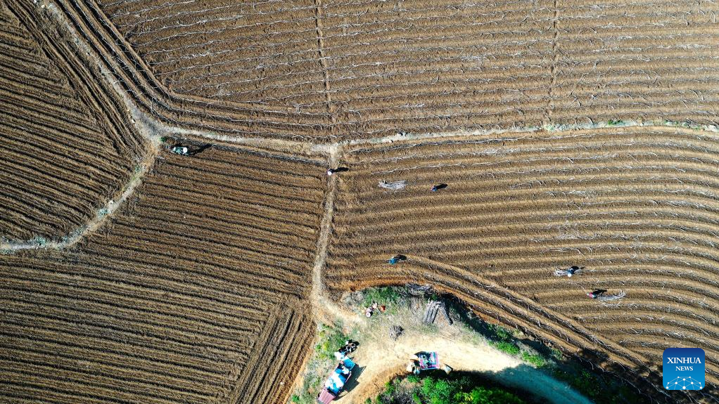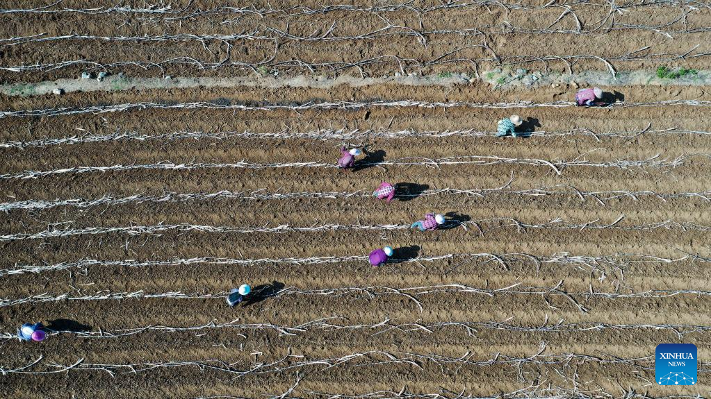 Aerial photo shows farmers working in the sugar cane fields in Dahua Township of Dahua Yao Autonomous County, south China's Guangxi Zhuang Autonomous Region, April 8, 2022. (Xinhua/Zhang Ailin)