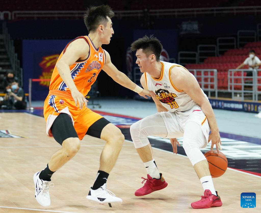 Bai Haotian (R) of Shenzhen Leopards breaks through during the 2nd round playoff match between Shanghai Sharks and Shenzhen Leopards at the 2021-2022 season of the Chinese Basketball Association (CBA) league in Nanchang, east China's Jiangxi Province, April 10, 2022. (Xinhua/Hu Chenhuan)
