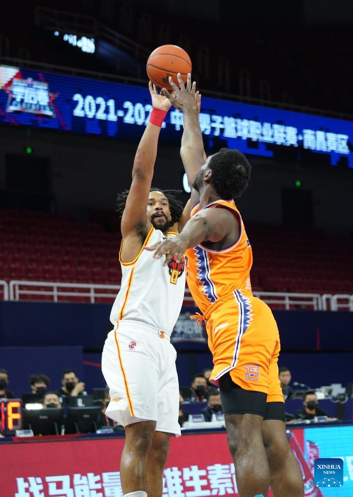 Askia Booker (C) of Shenzhen Leopards goes for the basket during the 2nd round playoff match between Shanghai Sharks and Shenzhen Leopards at the 2021-2022 season of the Chinese Basketball Association (CBA) league in Nanchang, east China's Jiangxi Province, April 10, 2022. (Xinhua/Hu Chenhuan)
