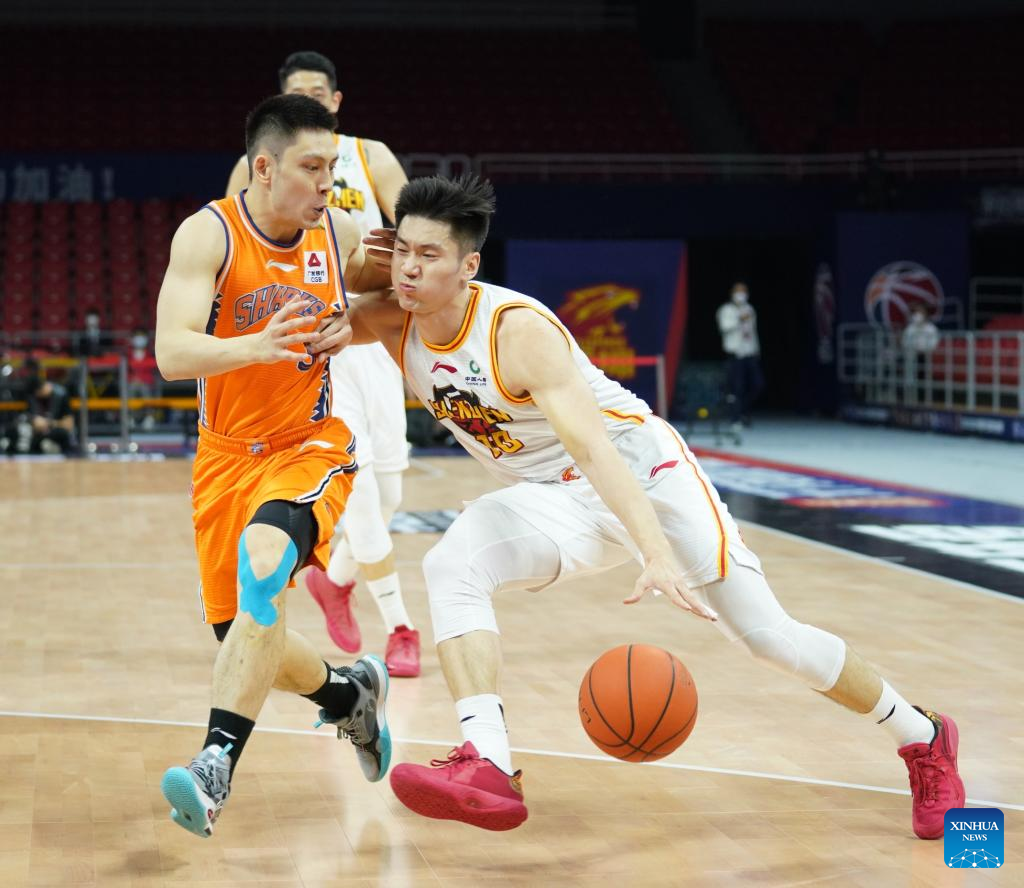 Wang Zhelin (R) of Shanghai Sharks breaks through during the 2nd round playoff match between Shanghai Sharks and Shenzhen Leopards at the 2021-2022 season of the Chinese Basketball Association (CBA) league in Nanchang, east China's Jiangxi Province, April 10, 2022. (Xinhua/Hu Chenhuan)