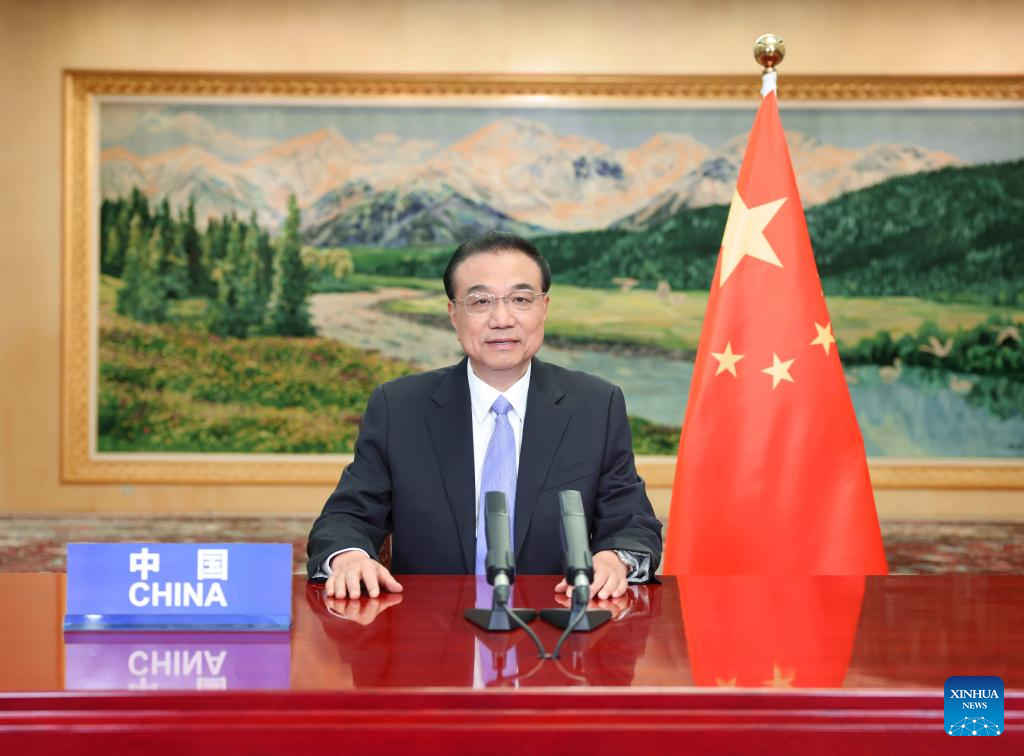 Chinese Premier Li Keqiang delivers a speech online while attending the opening ceremony of a special ministerial conference of the Forum for Economic and Trade Cooperation between China and Portuguese-speaking Countries (PSCs), also known as Forum Macao, in Beijing, capital of China, April 10, 2022. (Xinhua/Wang Ye)