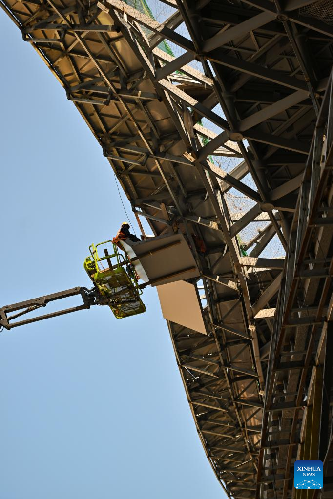A man works at the construction site of Haikou duty-free shopping complex in Haikou, south China's Hainan Province, April 10, 2022. With a total construction area of about 926,000 square meters, the Haikou duty-free shopping complex project is expected to be officially put into use this year. (Xinhua/Guo Cheng)