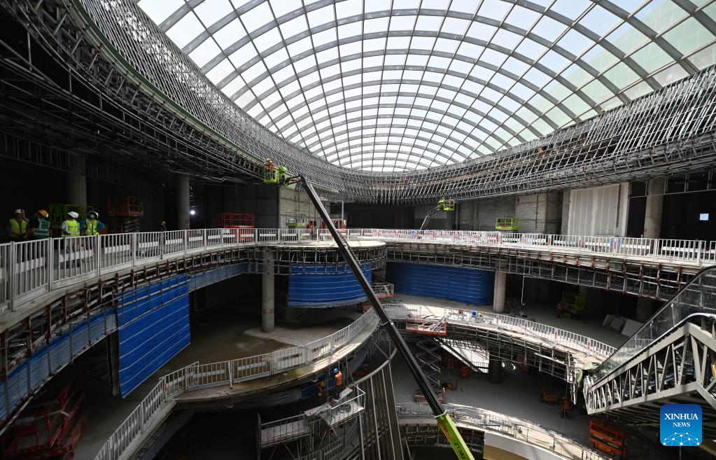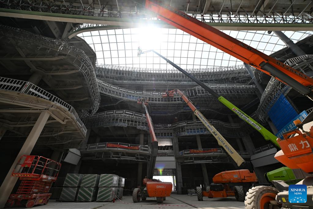 People work at the construction site of Haikou duty-free shopping complex in Haikou, south China's Hainan Province, April 10, 2022. With a total construction area of about 926,000 square meters, the Haikou duty-free shopping complex project is expected to be officially put into use this year. (Xinhua/Guo Cheng)