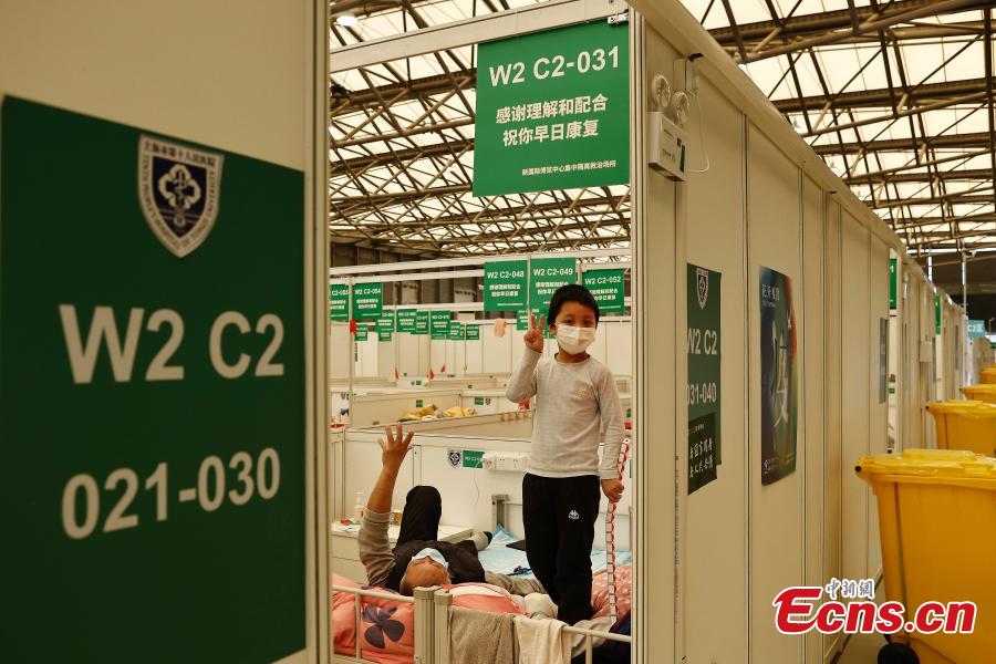 Photo shows a child patient with his family member in the quarantine zone at the Shanghai New International Expo Center, east China's Shanghai, April 10, 2022. (Photo: China News Service/Yin Liqin)