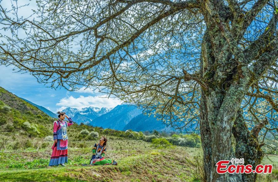 Wild plum blossoms are seen in Ya'an city, southwest China's Sichuan Province. Idyllic landscape with fresh green meadows, blooming trees and snowcapped mountain tops in the background attracts visitors. (Photo: China News Service/Zhou Wanlong)