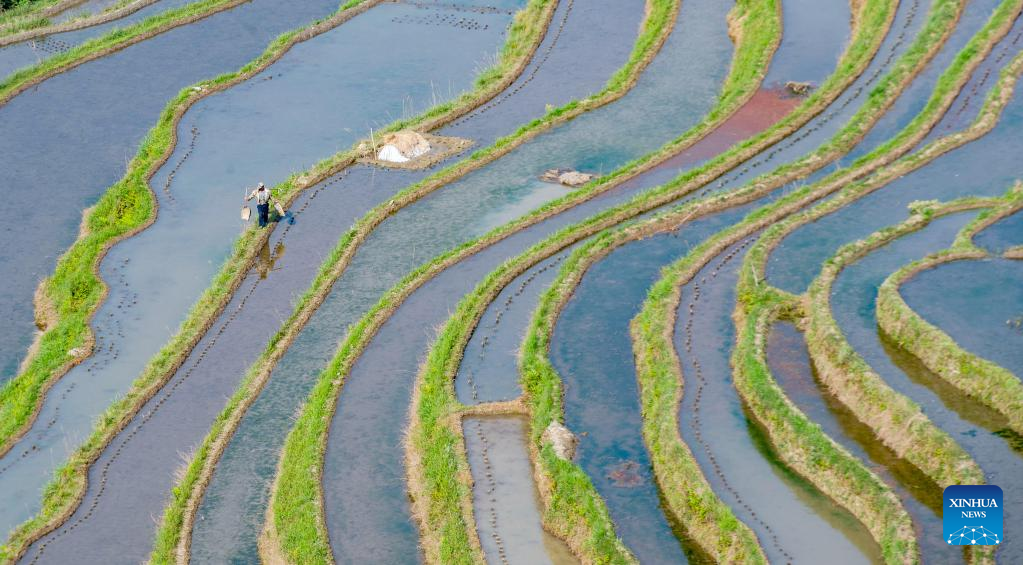 A farmer works in terraced fields in Pingyin Village of Congjiang County, southwest China's Guizhou Province, April 11, 2022.