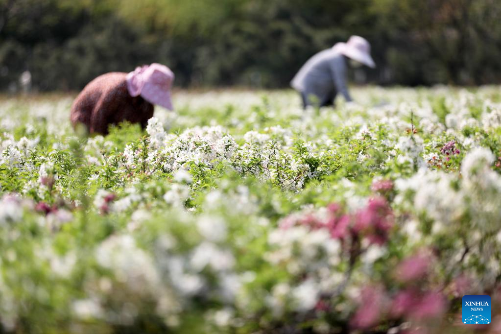 Farmers tend flowers at a flower farm in Tancheng County in Linyi, east China's Shandong Province, April 11, 2022.
