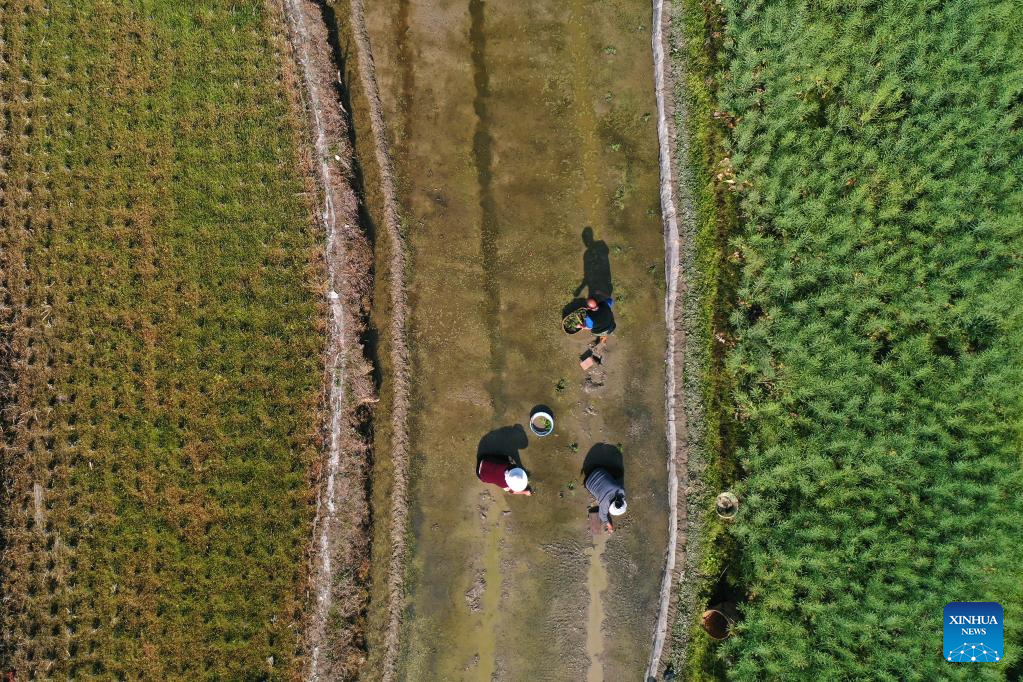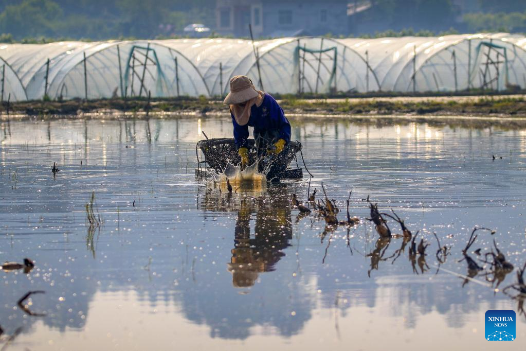 A farmer works in lotus root fields in Longshan County, central China's Hunan Province, April 11, 2022.