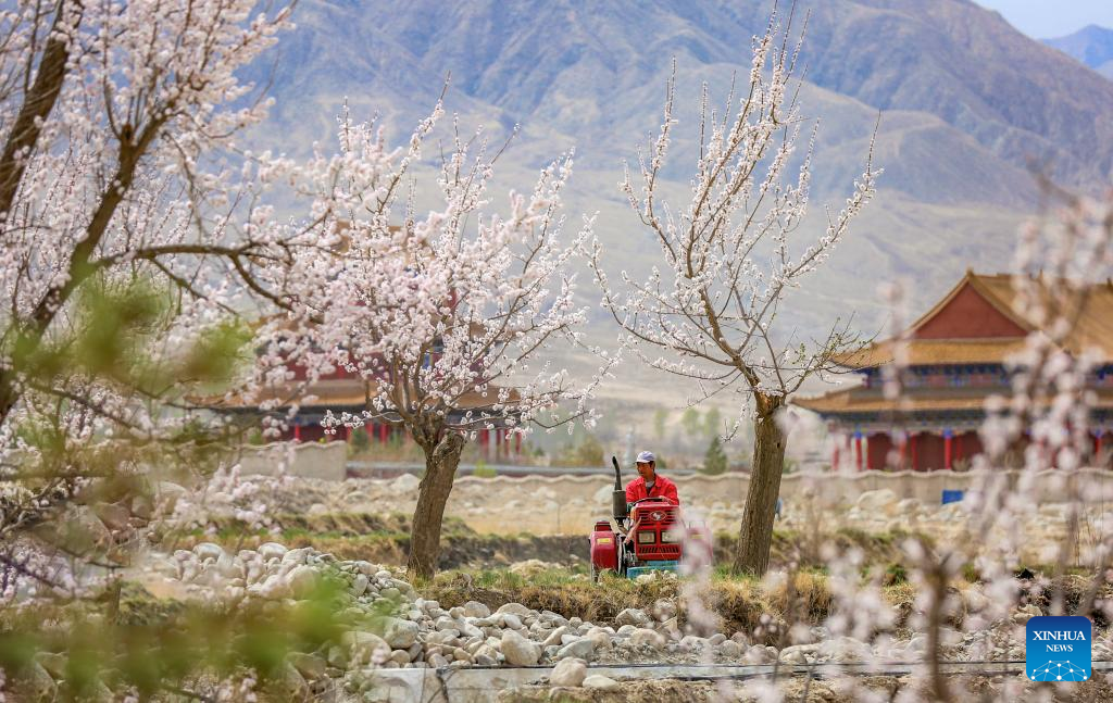 A farmer operates a farming machine in fields in Suzhou District of Jiuquan City, northwest China's Gansu Province, April 10, 2022.