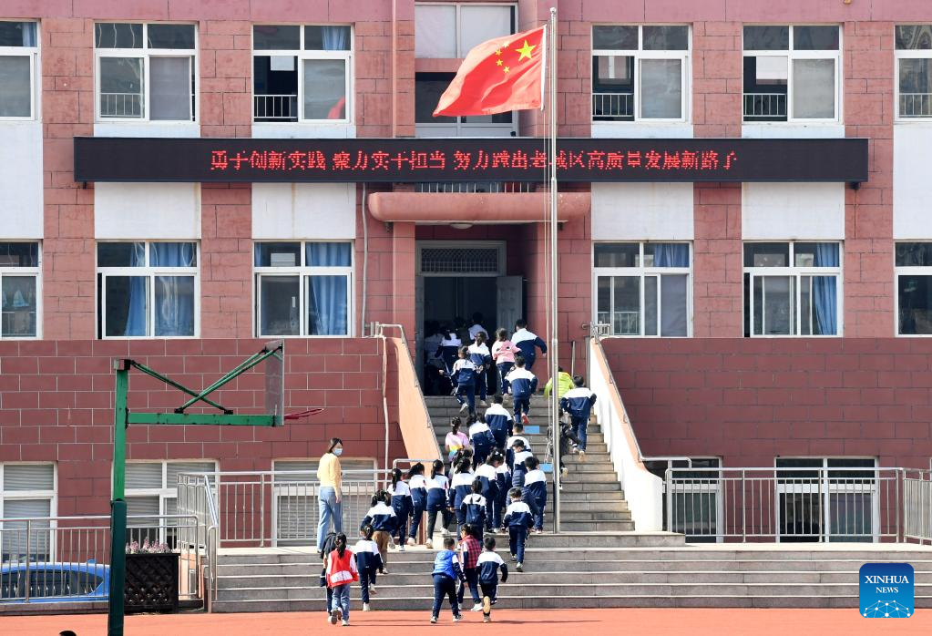 Students are seen at Qingdao Huachuan Road Primary School in Qingdao, east China's Shandong Province, April 11, 2022. Primary and middle schools in Qingdao resumed classes on Monday. (Xinhua/Li Ziheng)