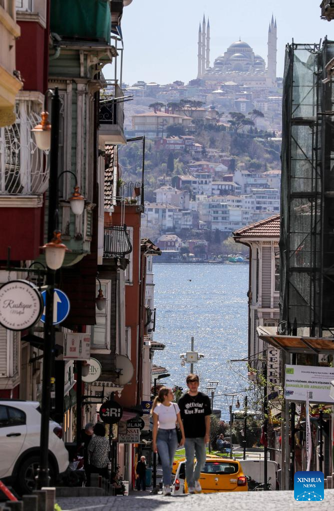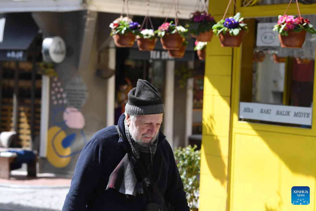 People walk on a street in the springtime in Istanbul, Turkey, April 10, 2022. (Photo by Unal Cam/Xinhua)