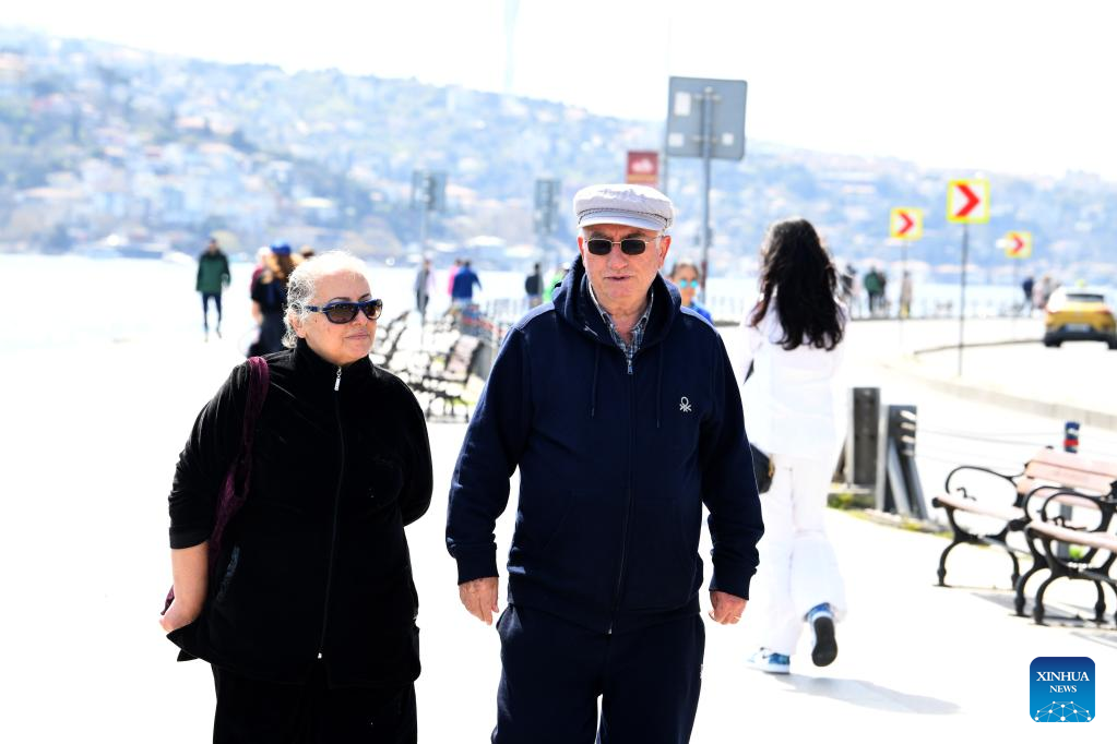 People walk along the Bosporus Strait in the springtime in Istanbul, Turkey, April 10, 2022. (Xinhua/Shadati)