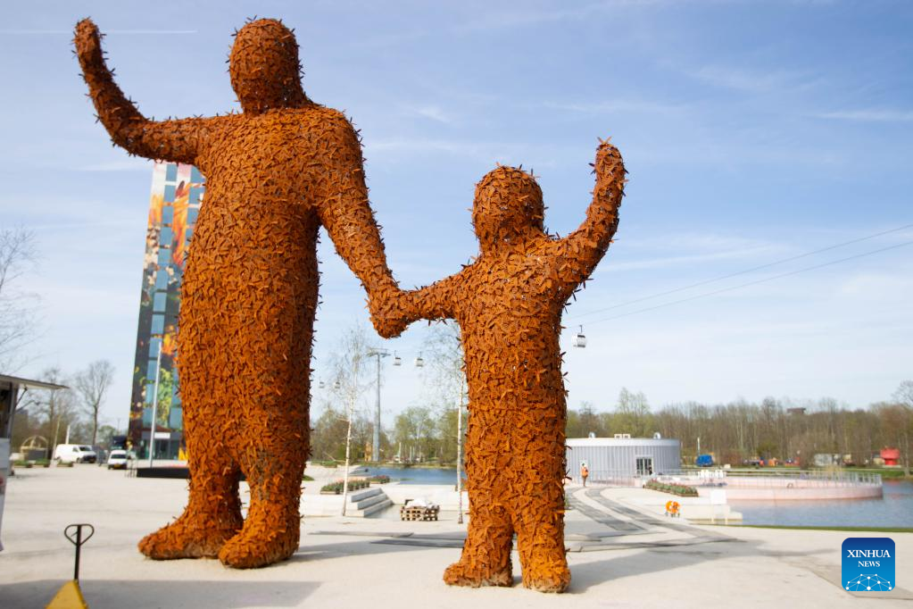 Photo taken on April 11, 2022 during a press preview shows the artwork Beehold by Florentijn Hofman at Floriade Expo 2022 in Almere, the Netherlands. Floriade Expo 2022, a world horticultural exhibition, is set to be held in Almere from April 14 to Oct. 9. (Photo by Sylvia Lederer/Xinhua)