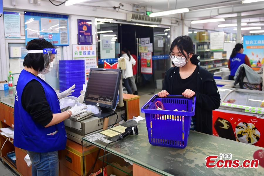 Photo shows some residents shop at a supermarket after some restrictions in the complex are lifted in east China's Shanghai, April 11, 2022. (Photo: China News Service/Tian Yuhao)