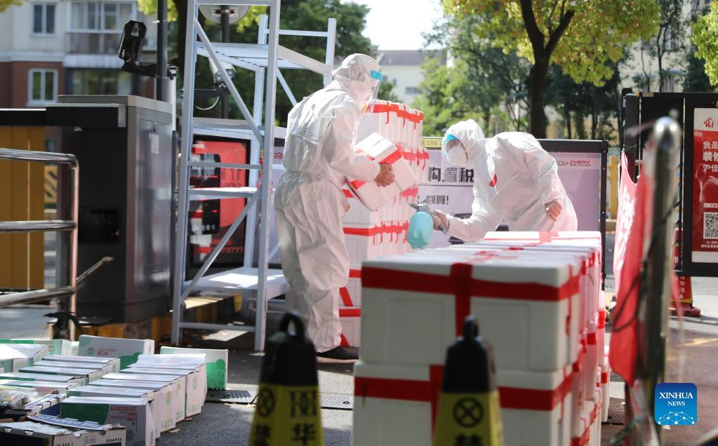 Shi Zhongliang (L) delivers parcels for residents under temporary closed-off management in east China's Shanghai, April 11, 2022. Shi Zhongliang, a resident of Qibao Township, Minhang District of Shanghai, now renders his service as a volunteer in his community. His residential community has been under closed-off management since March 18 due to the resurgence of COVID-19. Soon after that, Shi joined the community volunteer team spontaneously organized by the residents from the same community. The team, with only seven members from the start, has grown as big as 40 within a month. Shi and his teammates are mainly responsible for delivering the living materials purchased online by the residents. To ensure the safety of the supplies before delivery, the volunteers disinfect every parcel. And the delivery work usually takes them about ten kilometers' shuttling in the neighborhood on a daily basis. (Xinhua/Fang Zhe)