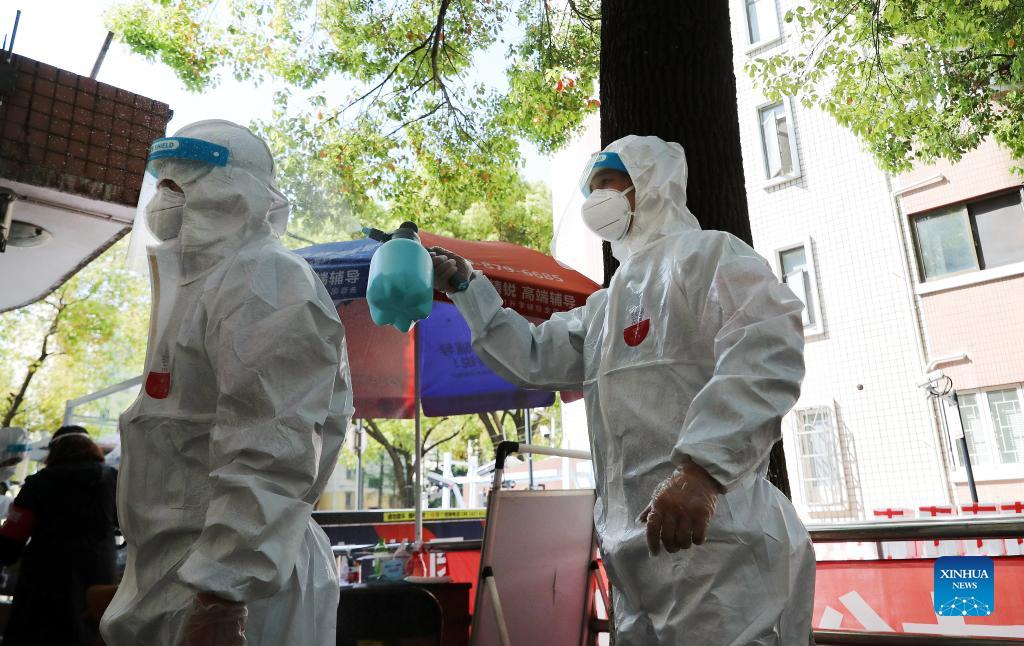 Shi Zhongliang (R) sprays disinfectants on the protective gear of his teammate in east China's Shanghai, April 11, 2022. Shi Zhongliang, a resident of Qibao Township, Minhang District of Shanghai, now renders his service as a volunteer in his community. His residential community has been under closed-off management since March 18 due to the resurgence of COVID-19. Soon after that, Shi joined the community volunteer team spontaneously organized by the residents from the same community. The team, with only seven members from the start, has grown as big as 40 within a month. Shi and his teammates are mainly responsible for delivering the living materials purchased online by the residents. To ensure the safety of the supplies before delivery, the volunteers disinfect every parcel. And the delivery work usually takes them about ten kilometers' shuttling in the neighborhood on a daily basis. (Xinhua/Fang Zhe)