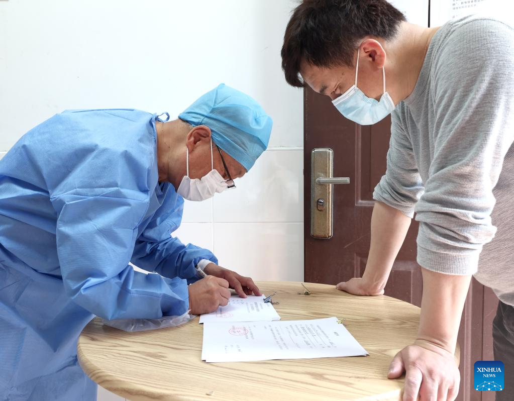 Wei Gang (L) registers information to make a pass for a resident who requires emergency treatment at a residential area in Baoshan District of Shanghai, east China, April 12, 2022. (Xinhua/Chen Jianli)