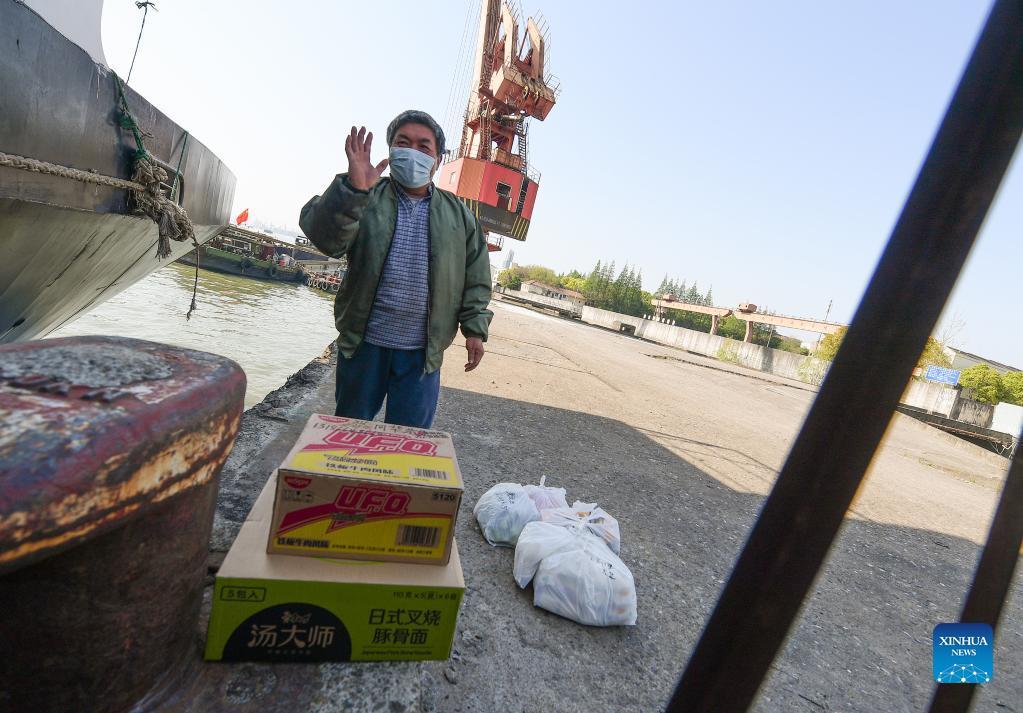 Zhang Tonghua receives his food packages in east China's Shanghai, April 11, 2022. On April 10, E-commerce platform Hema Fresh, Alibaba's fresh-food chain, received an online order for food including vegetables, instant noodles, steamed buns and bread which needed to be delivered to Haibao wharf at about 10 kilometers away. Zhu Yongkang, deliveryman of Hema Fresh, decided to send this order although he said that he usually only work within three kilometers around the store. He set off on a delivery bike with a spare battery. He knew that in this special period, every package might help relieve the pressure of people under quarantine. When Zhu arrived at Haibao wharf, he was blocked by a fence. Due to the regulations on epidemic control, deliverymen cannot enter. A manager of the wharf helped him transfer the food package to the consignee Zhang Tonghua. Zhang Tonghua is a cargo ship owner from east China's Jiangsu Province. Due to the prevention and control measures, he could not dock to Shanghai. He had to temporarily moor at the shore close to Haibao wharf, but could not land and purchase daily necessities. He was so excited when receiving the food delivered to him. (Xinhua/Li He)