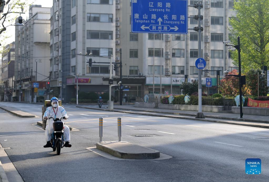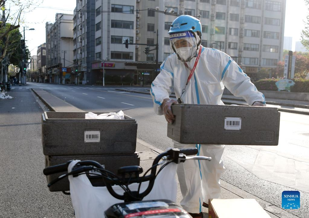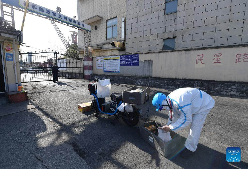 Deliveryman Zhu Yongkang puts on protective suit before leaving a Hema Fresh store in Yangpu District, east China's Shanghai, April 11, 2022. On April 10, E-commerce platform Hema Fresh, Alibaba's fresh-food chain, received an online order for food including vegetables, instant noodles, steamed buns and bread which needed to be delivered to Haibao wharf at about 10 kilometers away. Zhu Yongkang, deliveryman of Hema Fresh, decided to send this order although he said that he usually only work within three kilometers around the store. He set off on a delivery bike with a spare battery. He knew that in this special period, every package might help relieve the pressure of people under quarantine. When Zhu arrived at Haibao wharf, he was blocked by a fence. Due to the regulations on epidemic control, deliverymen cannot enter. A manager of the wharf helped him transfer the food package to the consignee Zhang Tonghua. Zhang Tonghua is a cargo ship owner from east China's Jiangsu Province. Due to the prevention and control measures, he could not dock to Shanghai. He had to temporarily moor at the shore close to Haibao wharf, but could not land and purchase daily necessities. He was so excited when receiving the food delivered to him. (Xinhua/Li He)