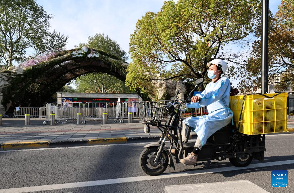 Wang Bin, Fuquan branch deliveryman of the delivery company YTO Express, delivers goods in east China's Shanghai, April 9, 2022. Cai Xiaobing is the branch manager of the delivery company YTO Express in Fuquan, Changning District, east China's Shanghai. Since early April, Cai has led his team to work around the clock to ensure delivery. They are now delivering daily supplies for about 2,000 households in several communities. (Xinhua/Chen Jianli)