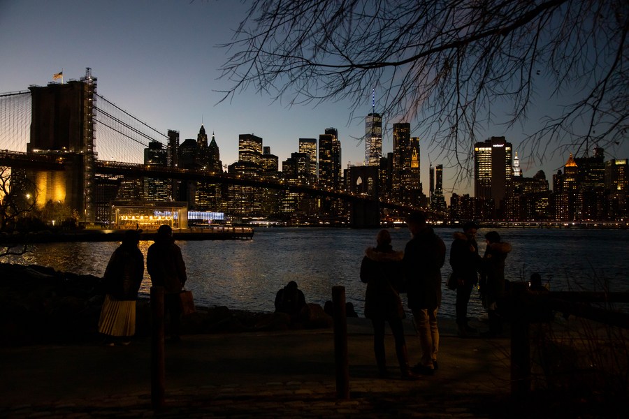 People watch the sunset behind the Lower Manhattan skyline in the Brooklyn borough of New York, the United States, Dec. 14, 2021. (Photo by Michael Nagle/Xinhua)