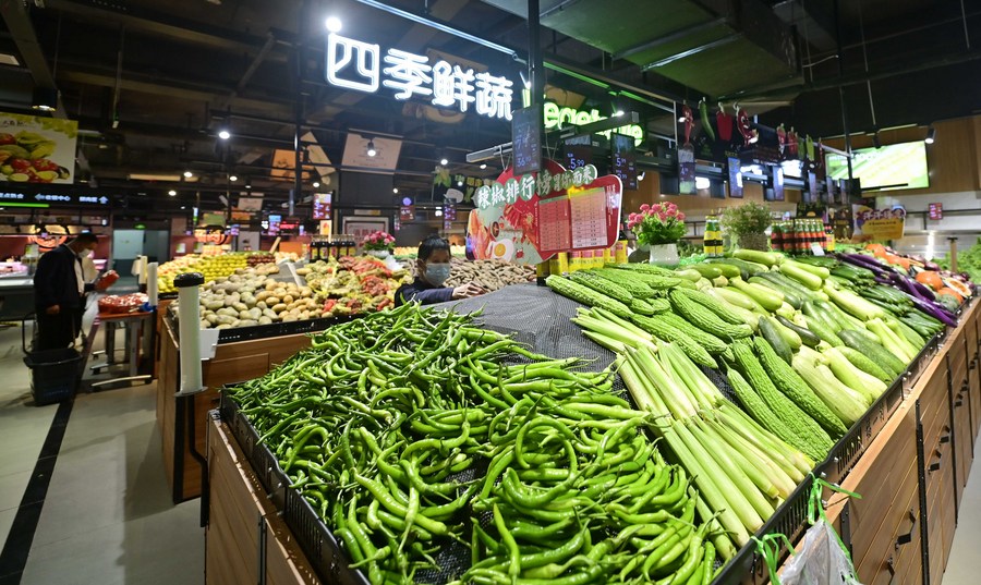 Residents shop for vegetables at a supermarket in Congjiang County, southwest China's Guizhou Province, April 11, 2022. (Photo by Wu Dejun/Xinhua)