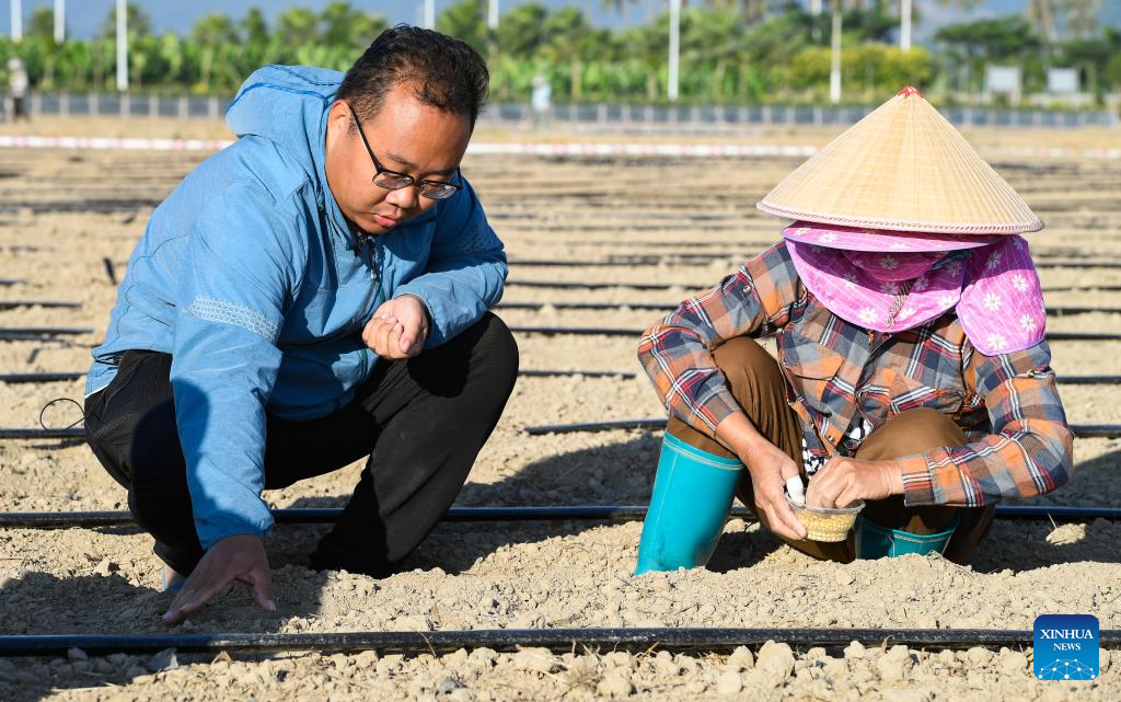 A graduate student (L) guides a farmer to plant soybeans at the Nanfan experiment base in Sanya, south China's Hainan Province, Nov. 25, 2021. The Yazhou Bay Seed Laboratory, which opened in May last year, has gathered over 800 research staff to work toward seed industry innovation in Hainan in collaboration with 19 member institutions. The laboratory is situated in the Nanfan breeding base in Hainan, which is dubbed the "silicon valley" of China's seed industry. Thousands of scientists from across the country visit the base each year to undertake seed breeding, thanks to its unique light and heat resources. (Xinhua/Yang Guanyu)