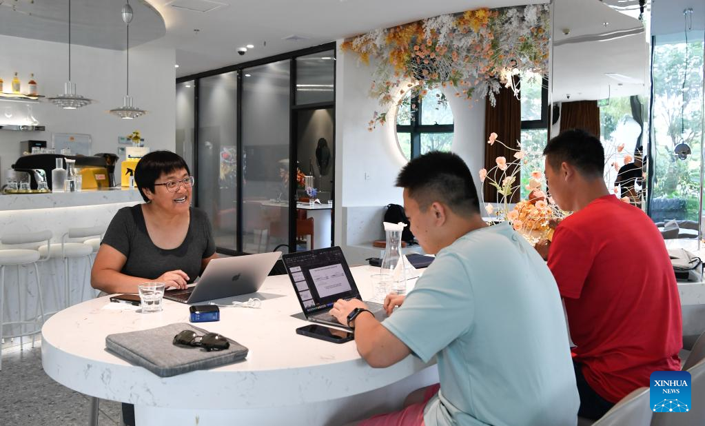 Researchers have a discussion in south China's Hainan Province, Nov. 24, 2021. The Yazhou Bay Seed Laboratory, which opened in May last year, has gathered over 800 research staff to work toward seed industry innovation in Hainan in collaboration with 19 member institutions. The laboratory is situated in the Nanfan breeding base in Hainan, which is dubbed the "silicon valley" of China's seed industry. Thousands of scientists from across the country visit the base each year to undertake seed breeding, thanks to its unique light and heat resources. (Xinhua/Yang Guanyu)