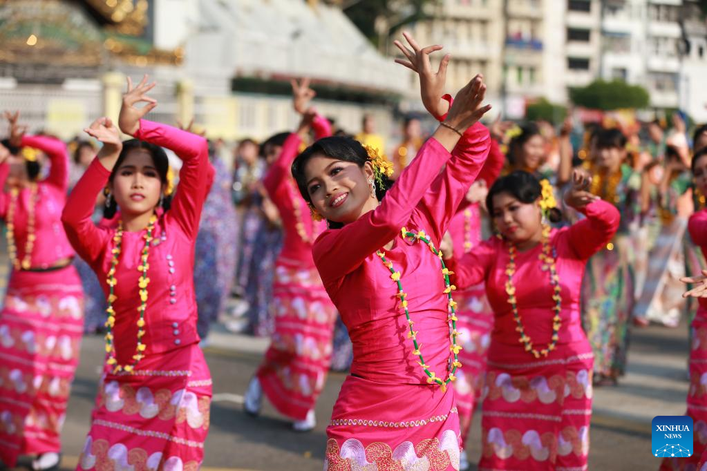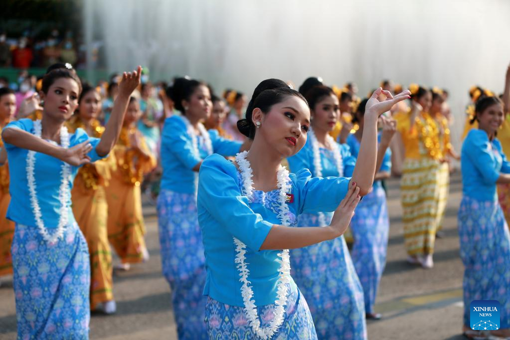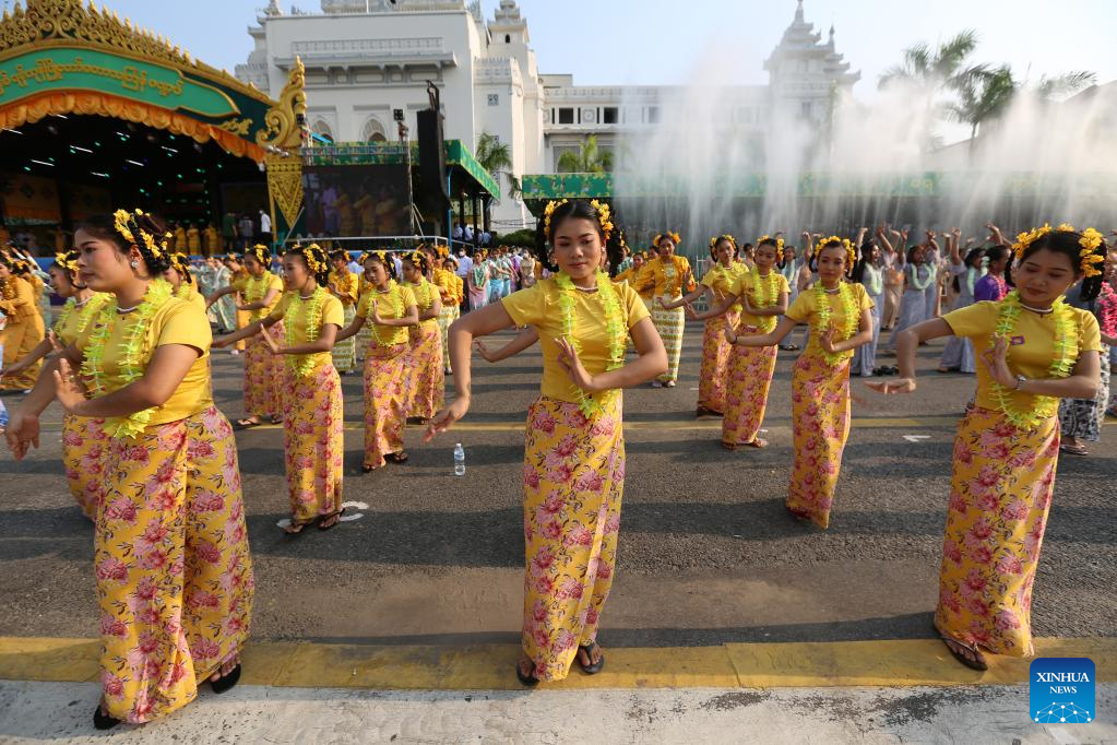 Dancers perform during the water festival in Yangon, Myanmar, April 13, 2022. Myanmar's traditional water festival kicked off across the country on Wednesday morning. (Xinhua/U Aung)