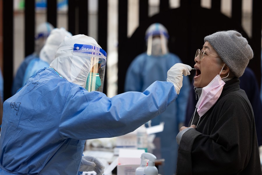 A medical worker from east China's Anhui Province takes a swab sample from a resident for nucleic acid test at a community in Huangpu District of Shanghai, east China, April 4, 2022. (Xinhua/Jin Liwang)