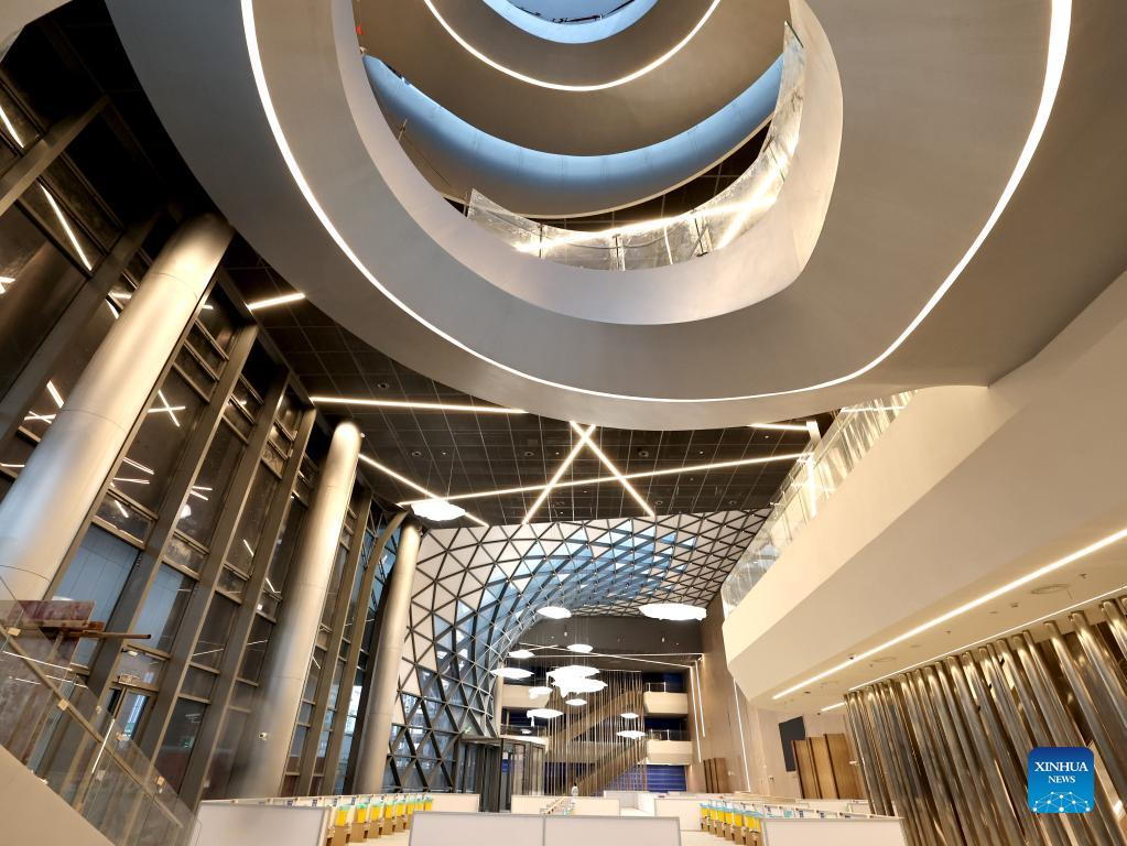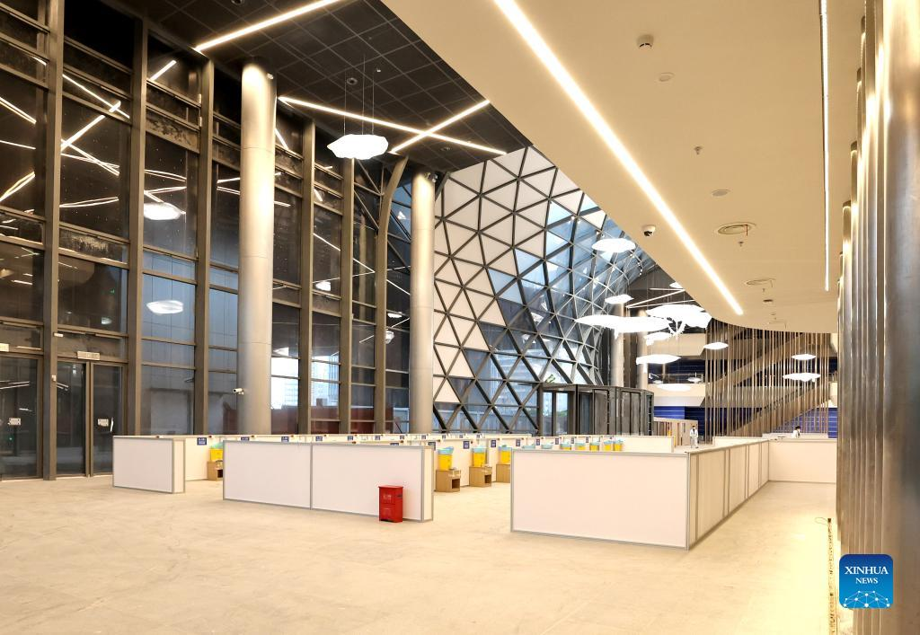 Photo taken on April 13, 2022 shows a view of a makeshift hospital transformed from a newly-built science center in east China's Shanghai. More than 600 people have worked around the clock to transform a newly-built science center into a makeshift hospital with a capacity of more than 1,080 beds, in an effort to help contain the recent outbreak of COVID-19 in the metropolis. (Xinhua/Chen Jianli)