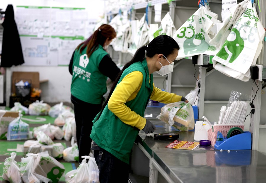 Staff members of the online grocery platform Meituan Maicai sort and pack ordered groceries in east China's Shanghai, April 12, 2022. (Xinhua/Jin Liwang)