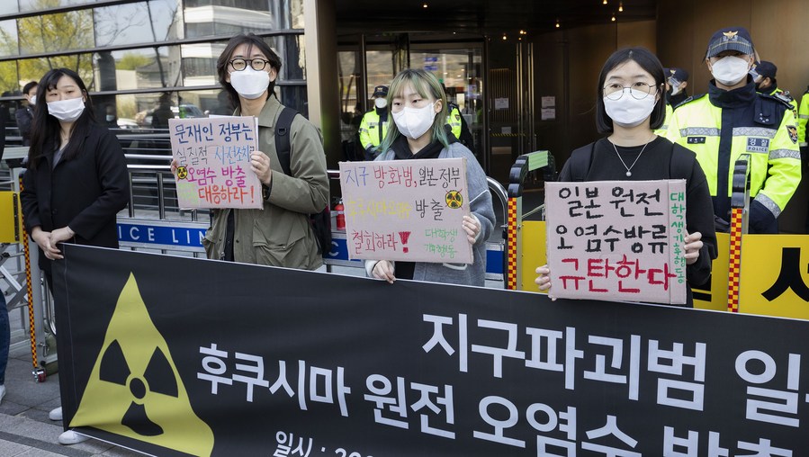 People protest against Japan's decision to dump radioactive wastewater from the crippled Fukushima Daiichi nuclear power plant into the Pacific Ocean outside Japanese embassy in Seoul, South Korea, April 14, 2021. (Photo by Xu Ruxi/Xinhua)